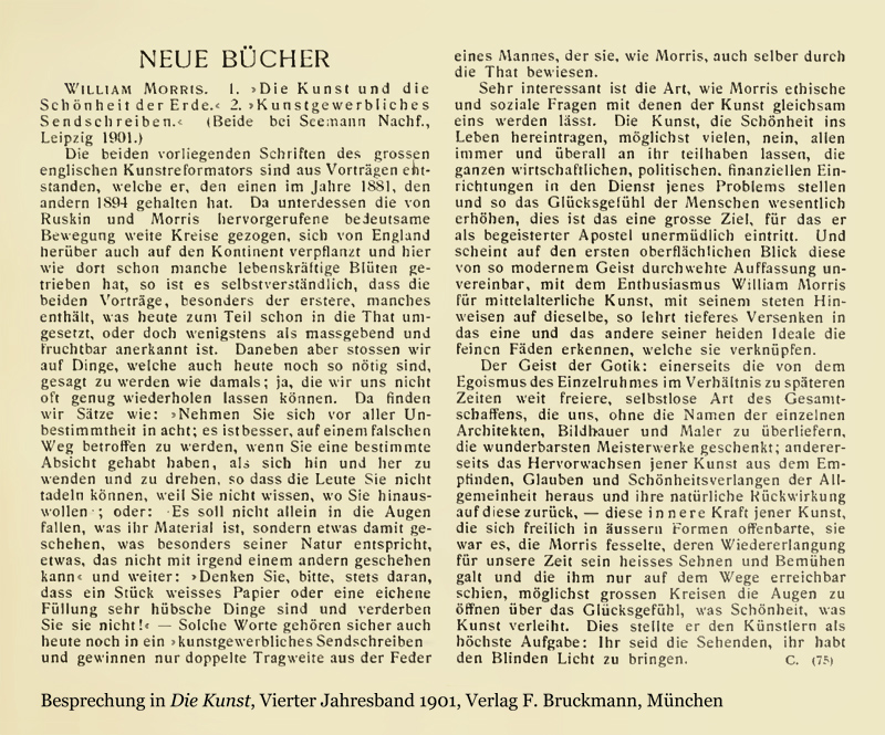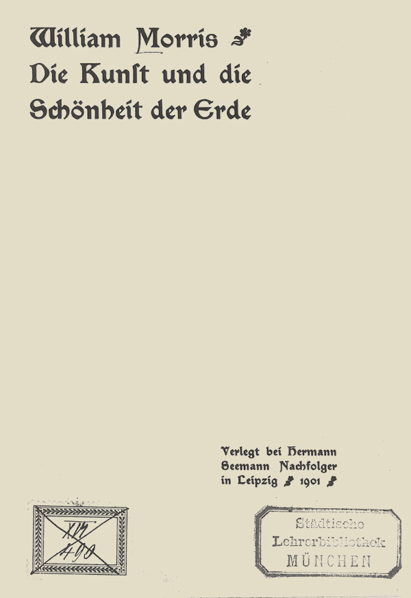 Ich bleibe bei meiner Behauptung, daß diejenigen, die schöne Dinge machen sollen, in einer schönen Gegend leben müssen, aber Sie müssen wissen, daß ich nicht vorhabe, für alle Handwerker einen Teil an jenen Gärten der Erde zu fordern, oder an jenen unvergleichlichen und eindrucksvollen Bergen und Wüsten, zu denen die Menschen pilgern, um sie zu sehen; das heißt keinen persönlichen Anteil. Die meisten von uns müssen sich mit den Berichten der Dichter und Maler über diese Gegenden begnügen, und sie müssen lernen, den engen Raum, der unser tägliches Leben umfängt, wegen der Schönheit und Harmonie zu lieben, die in ihm steckt.