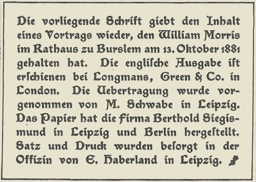 Obwohl nun niemand mehr als ich von der Bedeutung der Töpferkunst überzeugt sein kann und obwohl ich ihr Studium, wie ich hoffe, weder in künstlerischer noch in kunstgeschichtlicher Hinsicht vernachlässigt habe, so halte ich mich doch nicht für verpflichtet, das Thema Ihrer besonderen Kunst zu behandeln; weniger deshalb, weil ich von ihrer technischen Seite nicht mehr weiß als das, was mir für das Verständnis ihrer kunstgeschichtlichen Aspekte ausreichend erschien, sondern eher, weil ich glaube, daß es, so wie die Dinge heutzutage stehen, fast unmöglich ist, eine der ornamentierenden Künste von den anderen zu trennen. Ich glaube auch, daß es Sie nicht sehr interessieren und noch weniger informieren würde, wenn ich die allgemeinen Regeln wiederholen würde, die ein Designer in den gewerblichen Künsten befolgen sollte; bei der Gründung jener Schulen haben die Ausbilder diese Regeln deutlich und zufriedenstellend formuliert, und ich glaube, daß sie seither allgemein anerkannt sind, zumindest theoretisch. Vielmehr fühle ich mich wirklich verpflichtet, zu Ihnen über gewisse Dinge zu sprechen, die meine Gedanken ständig bewegen, über gewisse Überlegungen hinsichtlich des Zustandes und der Aussichten der Künste im allgemeinen, deren Vernachlässigung uns mit der Zeit tatsächlich in eine merkwürdige Situation bringen würde; das wäre eine Situation, in der ein Töpfer seiner Ware keinerlei Dekoration geben würde und in der er, falls er ein ganz logisch denkender Mensch wäre, überhaupt nicht wüßte, welche Form ein Gefäß haben sollte, wenn ihn nicht die beabsichtigte tatsächliche Verwendung des Gefäßes in die eine oder andere Richtung führen würde. Was ich über diese Dinge zu sagen habe, wird Ihnen wohl nicht sehr neu sein, und vielleicht wird es Sie mehr oder weniger verärgern; aber ich möchte Sie bitten, mir zu glauben, daß ich mir der Ehre bewußt bin, die Sie mir entgegenbringen, indem Sie mich auffordern, zu Ihnen zu sprechen. Ich kann nicht bezweifeln, daß Sie dies getan haben, damit Sie meine Ansichten über die Künste hören, und es scheint mir daher so zu sein, daß ich dieser Ehre kaum gerecht werden würde und Sie mißachtete, wenn ich mich hier hinstellte und ausgiebig über das spräche, was ich nicht denke. So möchte ich also um Ihre Erlaubnis bitten, offen zu sprechen, wie ich versichere, daß ich nicht leichtfertig sprechen werde.