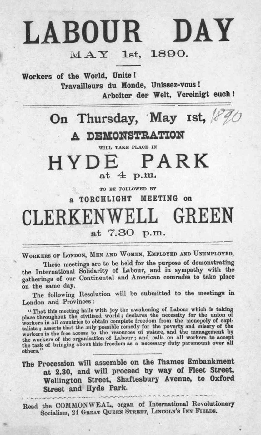 (Der Internationale Arbeiterkongress 1889 in Paris hatte aufgerufen, den 1. Mai zum Internationalen Tag der Arbeiter zu machen. Auf die Demonstration der Socialist League am 1. Mai, einem Arbeitstag, folgte am Sonntag den 4. Mai noch eine Kundgebung der anderen sozialistischen Gruppen und anderer Gewerkschaften mit mehr als 100.000 Teilnehmern.)