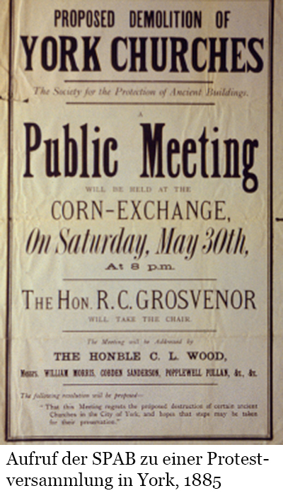 Für das, was noch übrig ist, bitten wir vor den Architekten selber, vor den offiziellen Wächtern der Gebäude und vor der allgemeinen Öffentlichkeit um deren Schutz und wir flehen sie an, sich zu erinnern, wie viel vom Glauben, den Gedanken und der Lebensweise vergangener Zeiten schon der Restauration unterzogen wurde und darüber nachzudenken, ob es denn möglich ist, Bauten zu restaurieren, deren lebendiger Geist (es kann nicht oft genug wiederholt werden) ein unabtrennbarer Teil dieses Glaubens, dieser Gedanken und vergangenen Lebensweise war. Für unseren Teil versichern wir ihnen furchtlos, dass die schlimmsten der bisherigen Restaurationen ein rücksichtsloses Wegnehmen der interessantesten Charakterzüge von Baumaterial und Bauart waren, während die exakte Analogie für die besten die Restaurierung eines alten Gemäldes ist: die teilweise verschwundene Arbeit des alten Meisters wird durch die trickreiche Hand irgendeines gedankenlosen und unoriginellen Pfuschers von heute nett und hübsch gemacht. Wenn wir schliesslich gefragt würden, ab welcher Menge an Kunst, Stil oder anderswie Interessantem ein Bauwerk schützenswert sei, dann antworten wir: alles, was als künstlerisch, pittoresk, historisch, antik oder als wesentlich angesehen werden kann. Kurz gesagt: Jede Arbeit, die gebildete und kunstverständige Menschen der Auseinandersetzung wert finden.